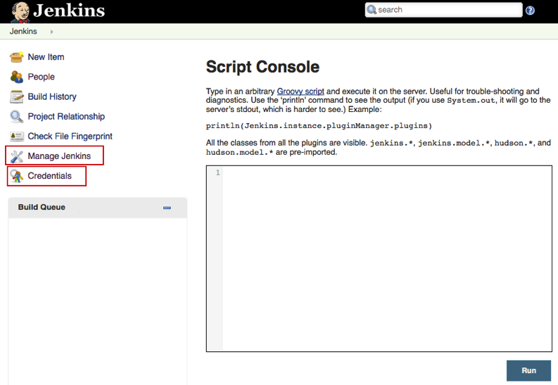 The Jenkins scripting console can be used to run arbitrary Groovy code and can be found under Manage Jenkins > Script Console or via /script from the root of the Jenkins install path.